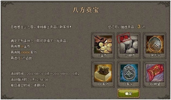 活动内容:每消费一定量的金币、军功,或征战一定次数您就可以获得一批来自远方贡品。每获得一批贡品,您都能在六件中抽选其一,就会得到银币、金币、军令、军功、威望、突飞令中的一种,更有机率出加倍暴击。