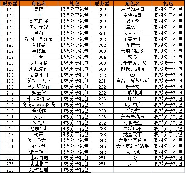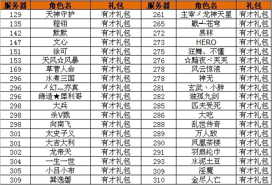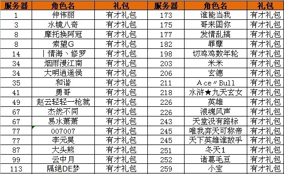 获得有才礼包的玩家有: