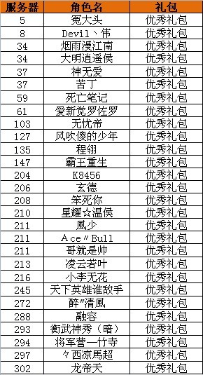 获得优秀礼包的玩家有:
