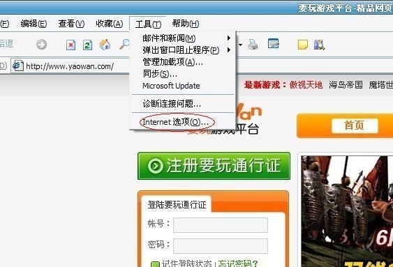 第一步:点击IE浏览器界面的“工具”栏目,选择“Inrernet选项”